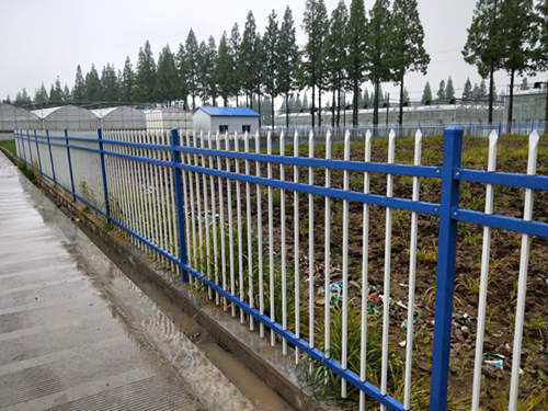 現(xiàn)貨藍(lán)白色三橫桿鋅鋼管護(hù)欄網(wǎng)價格冒雨安裝